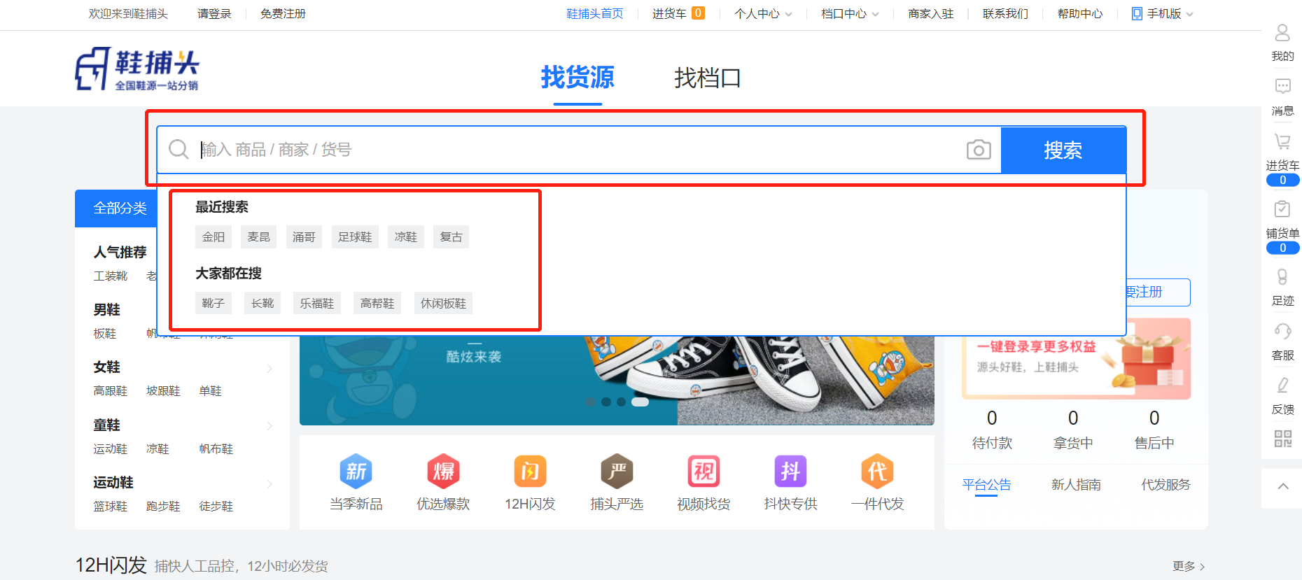 2、找货源搜索栏弹窗将显示您的“最近搜索”和“大家都在搜”。