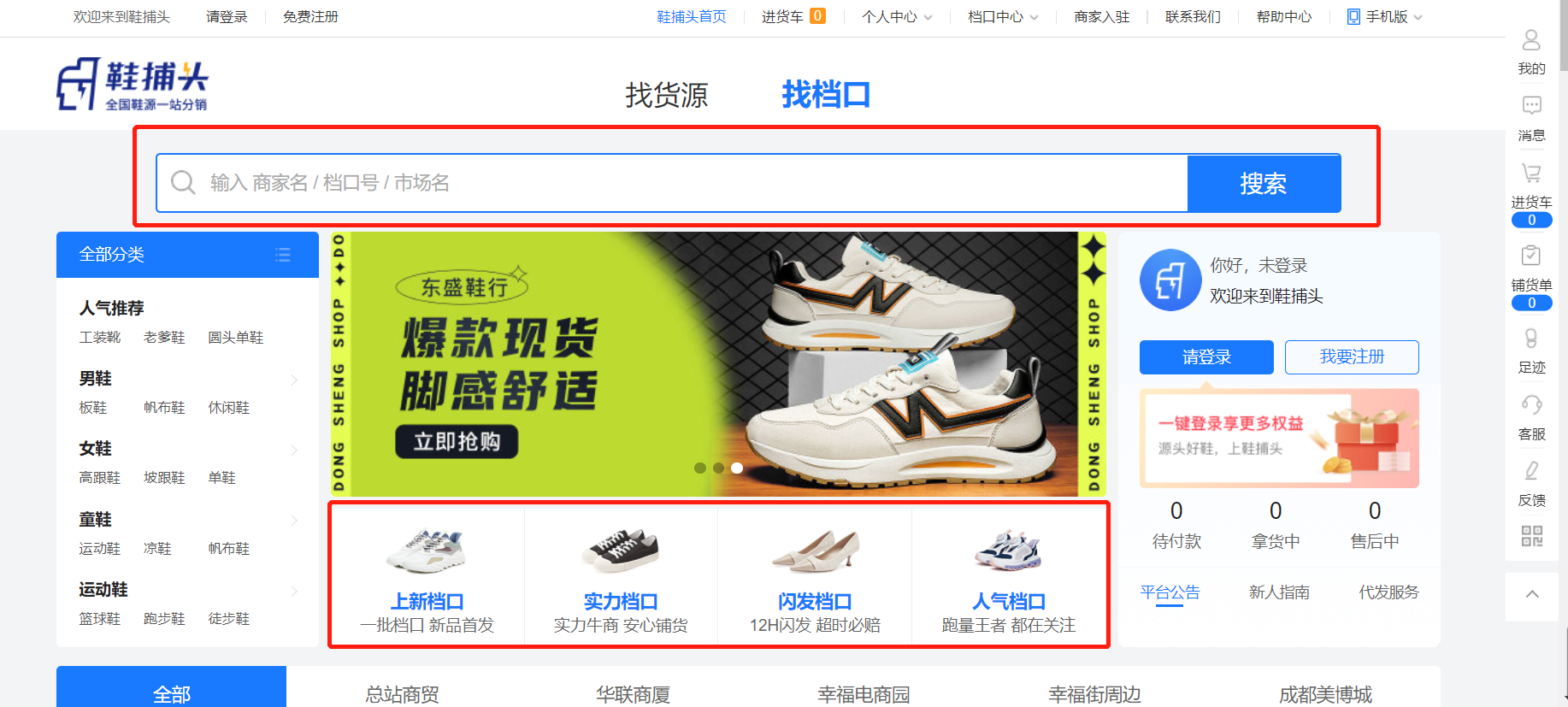 进入首页,在顶部搜索栏点击“找档口”输入搜索关键词,如“勇哥鞋业”,点击“搜索”