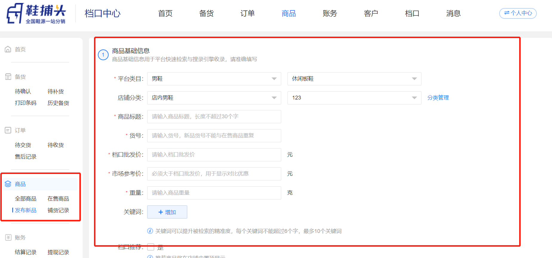 1、进入鞋捕头后台-档口中心,点击商品-发布新商品,
